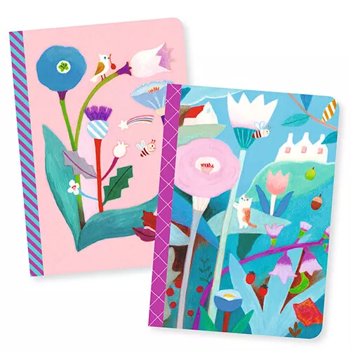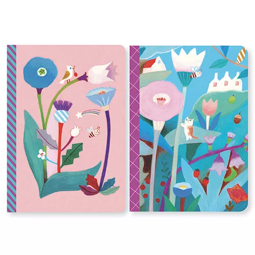 Twee handzame A6 notitieboekjes ‘Makoto Little Notebooks’ uit de lijn Lovely Paper van het Franse merk Djeco met op de voorkant fleurige illustraties van bloemen met metallic details. Eén notebook heeft blanco papier en het andere boekje is gelinieerd om te helpen bij het schrijven.