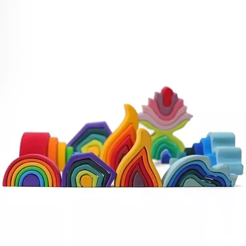De set bestaat uit zes vormen in verschillende blauwtinten, die op en in elkaar passen.