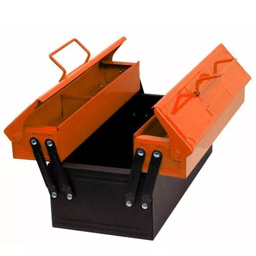 De kindergereedschapskist heeft een grote bak met daar bovenop 2 uitklapbare laden met 2 vakken voor het kleinere goed.