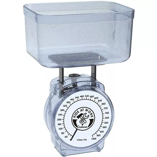 Meten is weten met deze mini weegschaal uit de serie Kids-at-Work van het Duitse speelgoedmerk Corvus. Hij kan in de keuken gebruikt worden, maar er kan natuurlijk van alles in gewogen worden!