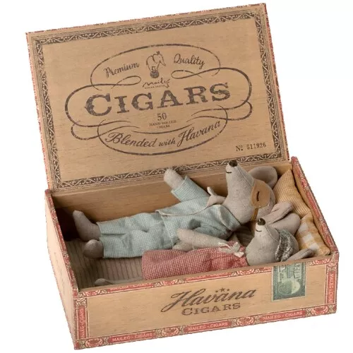 Twee kleine knuffelmuizen ‘Mum & Dad Mice’ in een speels sigarendoosje van het Deense merk Maileg. De vertederende muisjes passen in zakjes of tasjes en gaan makkelijk overal mee naar toe want ze hebben hun bedje altijd bij de hand.