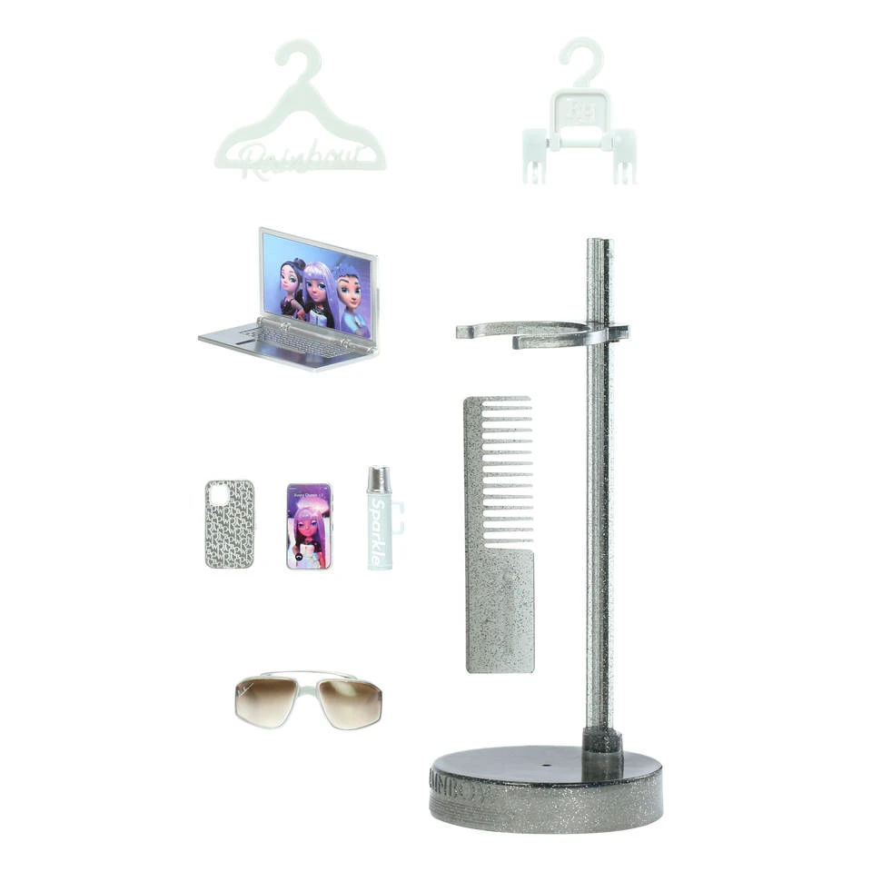 - De set bestaat uit een modepop, complete poppenoutfit, een paar poppenschoenen, poppenaccessoires: zonnebril, laptop, thermosfles, schattige mobiel met hoesje en poppenstandaard.