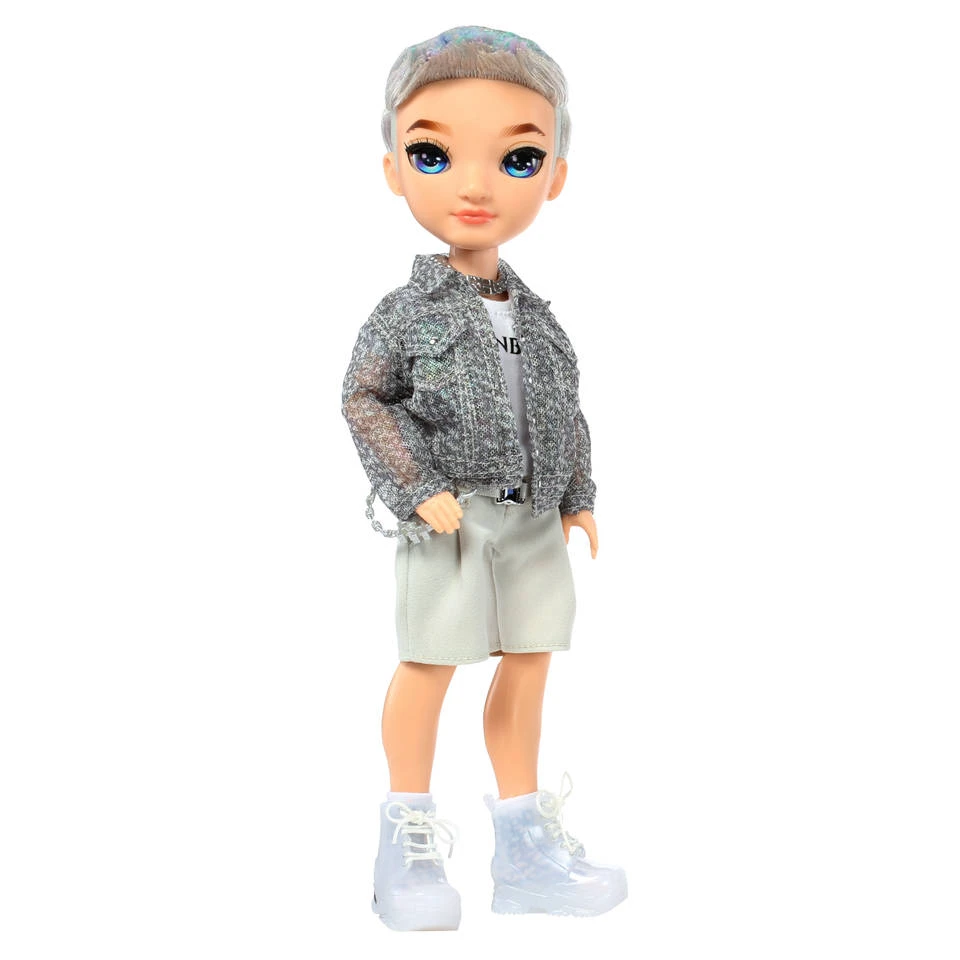 Rainbow High leerling Aidan is gekleed in een combinatie van glinsterend grijs, wit en paars. Zijn unieke stijl komt tot uiting in een glinsterend jack met opgestikte zakken, T-shirt met Rainbow-opdruk, grijze korte broek met riem, een paar sokken met print, een zilveren halsketting, een paar sneakers en superleuke accessoires. Ook heeft hij vrolijk kort haar met glinsterende paarse highlights, échte lange wimpers en glazen ogen.