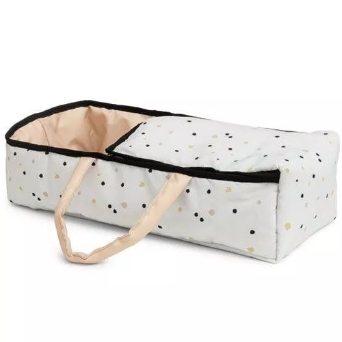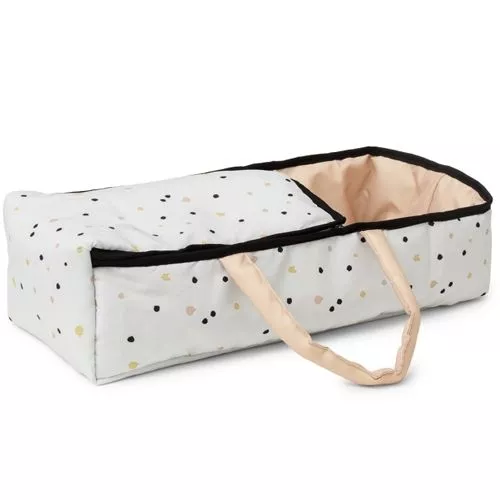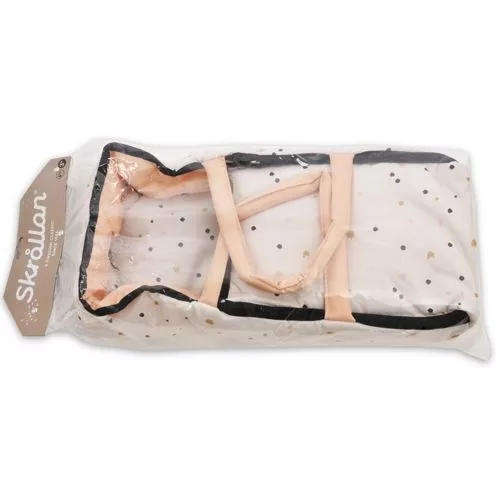 Een zachte poppendraagmand voor lievelingspoppen of -knuffels van het Zweedse merk Skrållan. De speelgoedreiswieg van stof wit met stippen in zachte tinten, is aan de binnenkant gevoerd met een abrikooskleurige stof en heeft hengsels. Zó kan de pop overal mee naar toe.