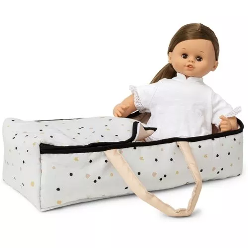 De poppendraagmand sluit met een rits en is geschikt voor poppen tot ongeveer 45 cm.