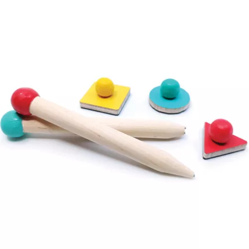 Het schetsbord heeft een handvat en wordt geleverd met twee houten pennen en drie geometrische stempels.