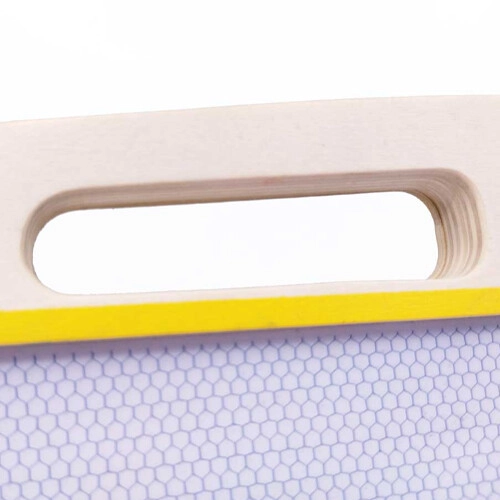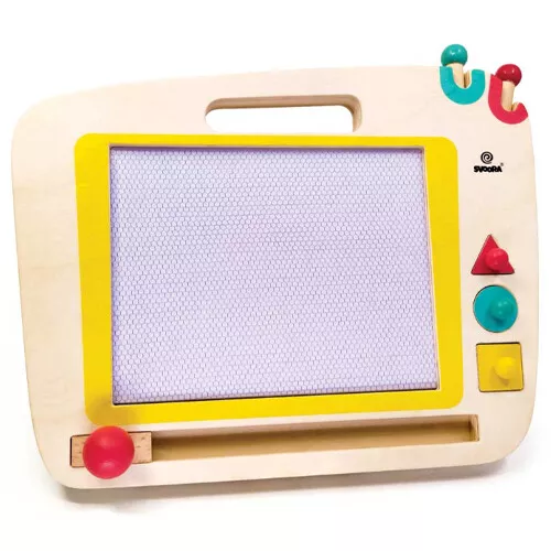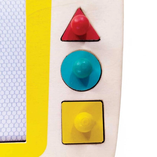 Gebruik de houten pen om keer op keer te tekenen en te schrijven en/of gebruik de stempels met geometrische vormen om een tekening nog mooier te maken. De tekening maakt gemakkelijk plaats voor een nieuw kunstwerk door het bord te wissen. Dit gaat eenvoudig door de “gum” heen en weer te schuiven. Schone lei, eindeloze mogelijkheden!